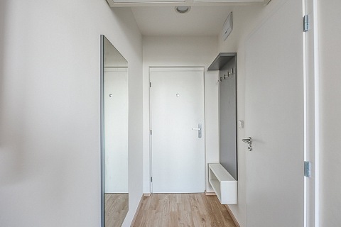 Byt s jihozápadní orientací o dispozici 1+kk v třetím patře disponuje s obytnou zónou a kuchyňským koutem s dostatečným prostorem na lůžko. Projekt je také jedinečný tím, že bytové jednotky lze jednoduše spojit a tím mohou vzniknout byty různých velikostí.